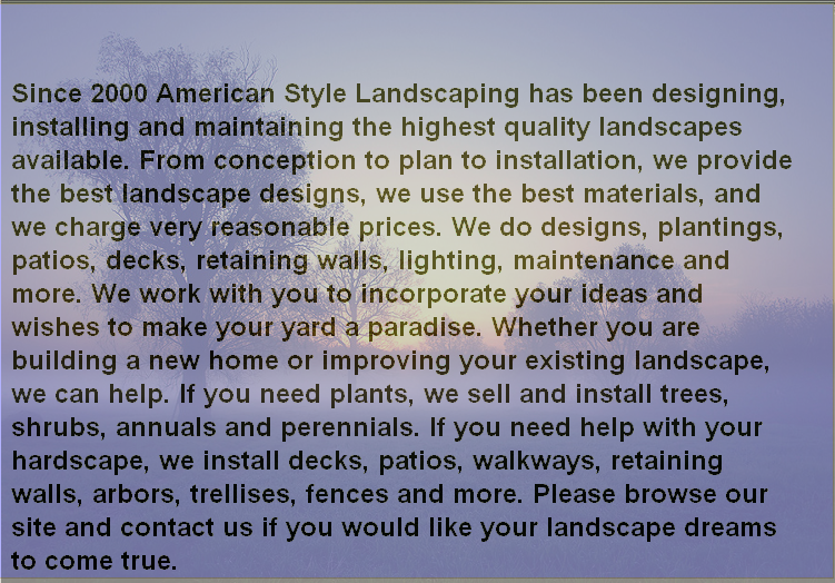 Since 2000 American Style Landscaping has been designing, installing and maintaining the highest quality landscapes available. From conception to plan to installation, we provide the best landscape designs, we use the best materials, and we charge very reasonable prices. We do designs, plantings, patios, decks, retaining walls, lighting, maintenance and more. We work with you to incorporate your ideas and wishes to make your yard a paradise. Whether you are building a new home or improving your existing landscape, we can help. If you need plants, we sell and install trees, shrubs, annuals and perennials. If you need help with your hardscape, we install decks, patios, walkways, retaining walls, arbors, trellises, fences and more. Please browse our site and contact us if you would like your landscape dreams to come true.